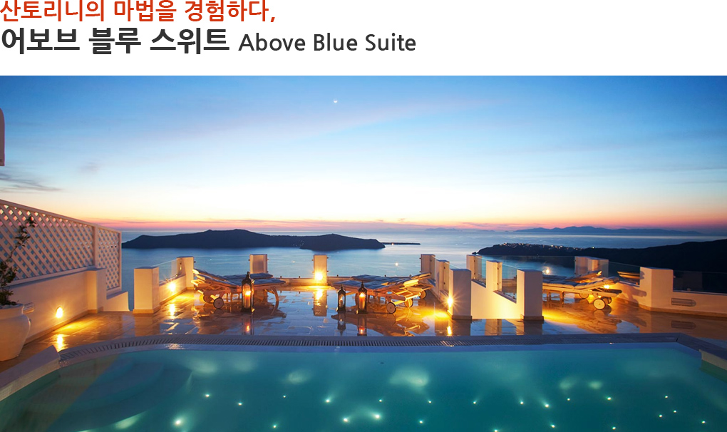산토리니 해안 절벽의 가장 놓은 지역에 자리한 성스러운 장소 높은 화산암 지형 언덕에 동굴을 파고 지은 건축 양식이 끝없이 펼쳐진 푸른 에게 해 Aegean Sea와 조화를 이룬다. 어보브 블루 Above Blue Suite라는 이름에 걸맞게 우아하고 깔끔하며, 산토리니의 정제되고 신성한 분위기를 조성해 이곳을 찾은 허니무너에게 진정한 로맨틱을 선사한다.